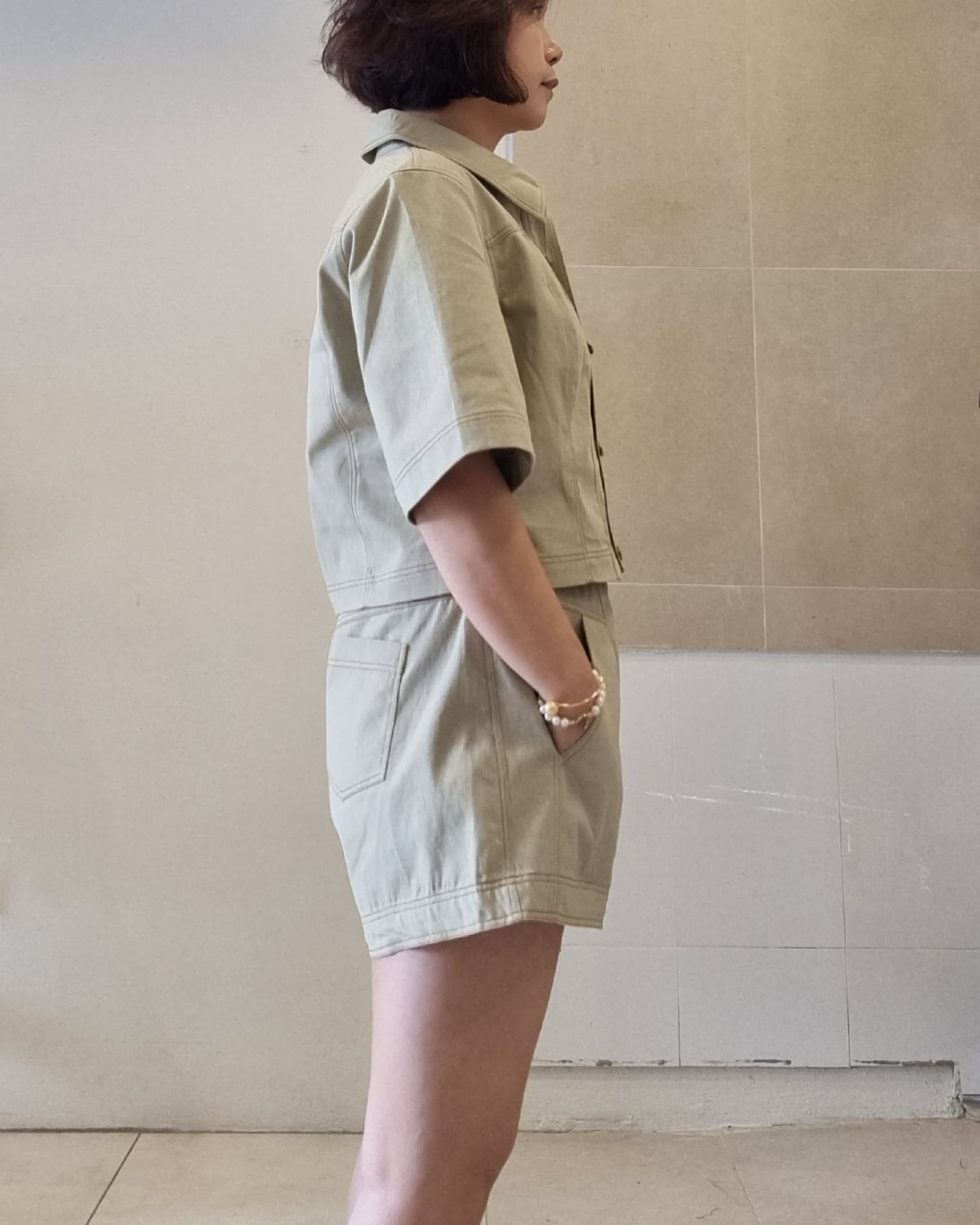 Structured short set with contrast top-stitching. The button-up shirt and high-waist shorts feature clean lines and front pockets for a relaxed yet polished look.