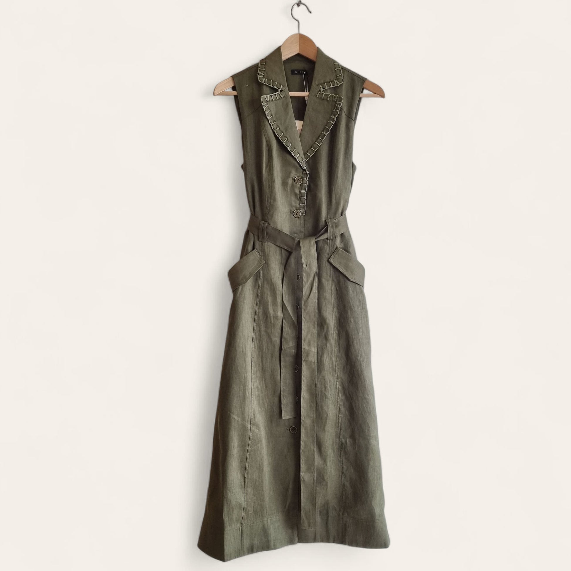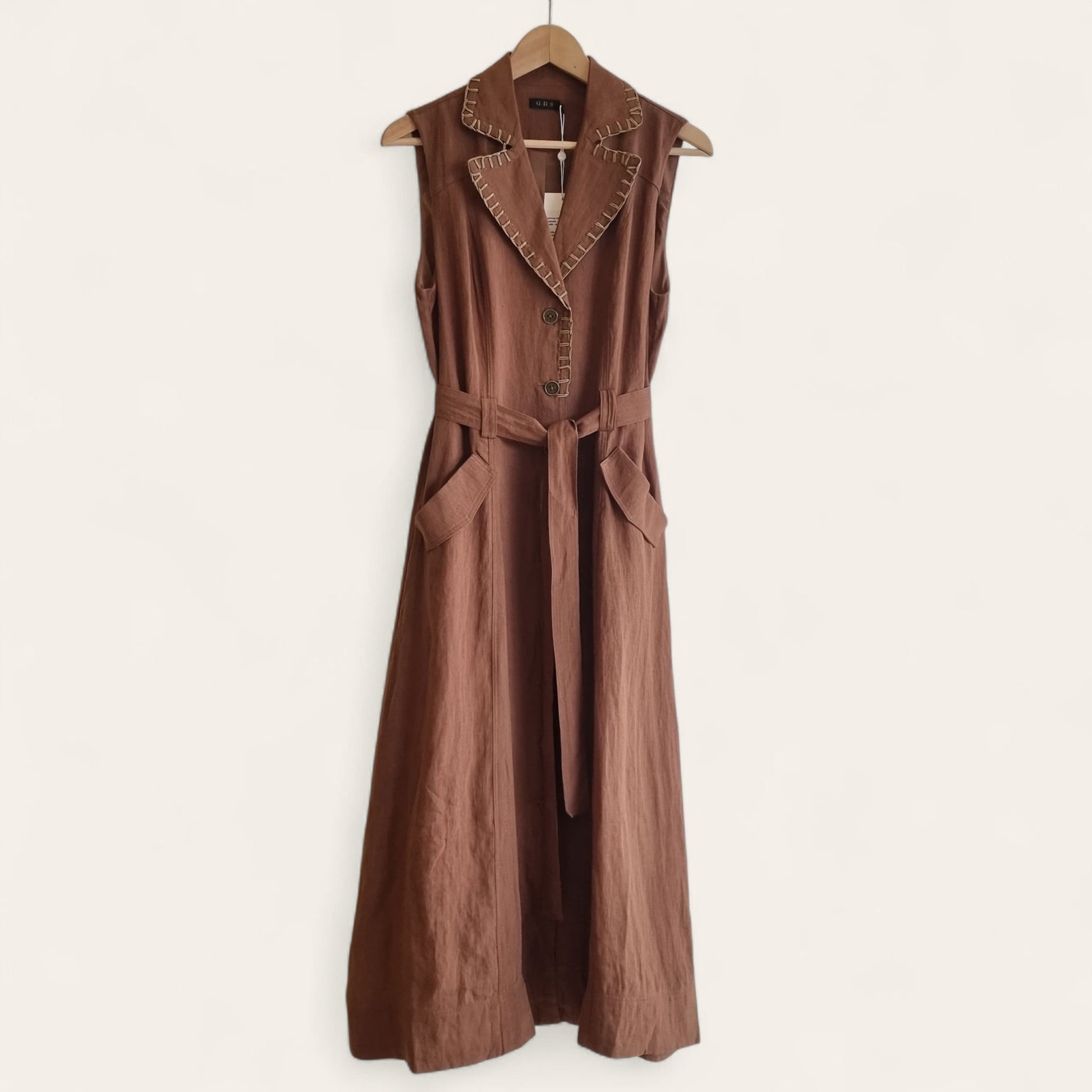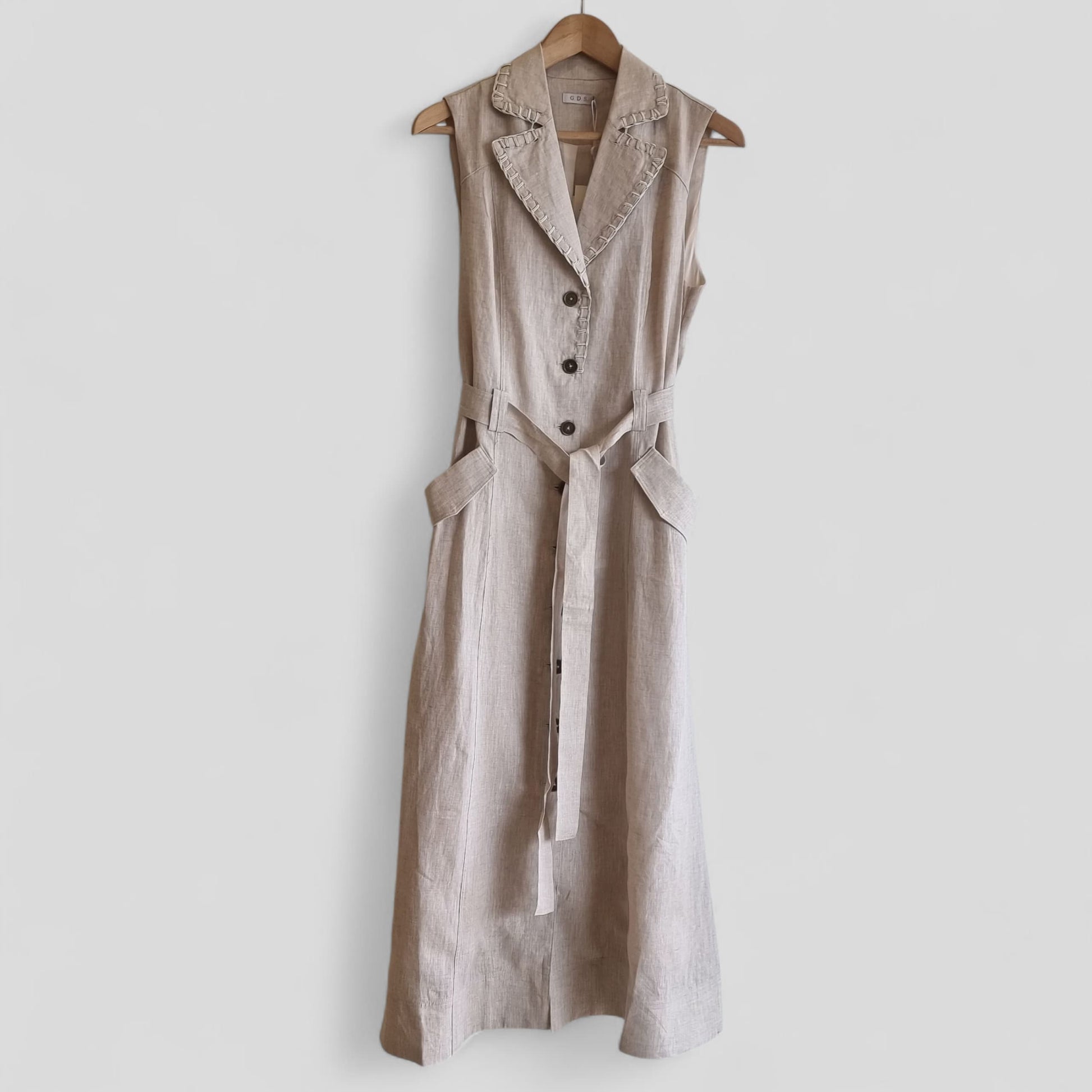A timeless sleeveless linen dress featuring delicate contrast stitching along the lapel. Designed with a waist belt and side pockets for effortless style and comfort. Fully lined for a smooth fit and lightweight structure.