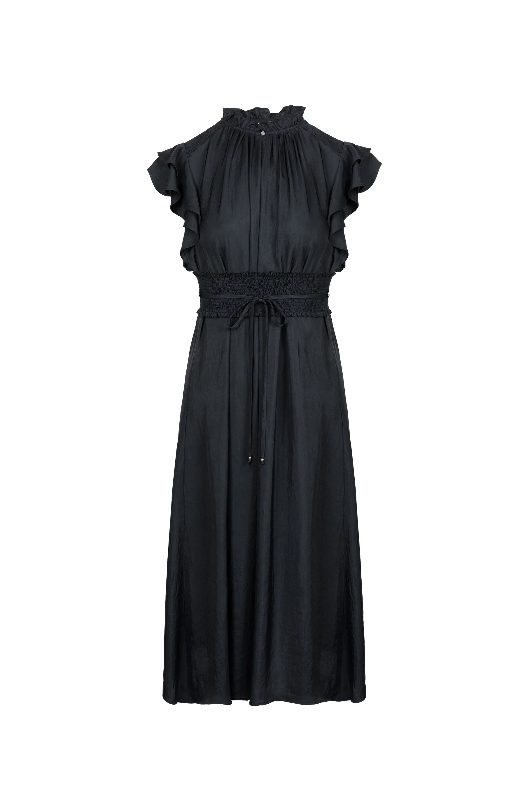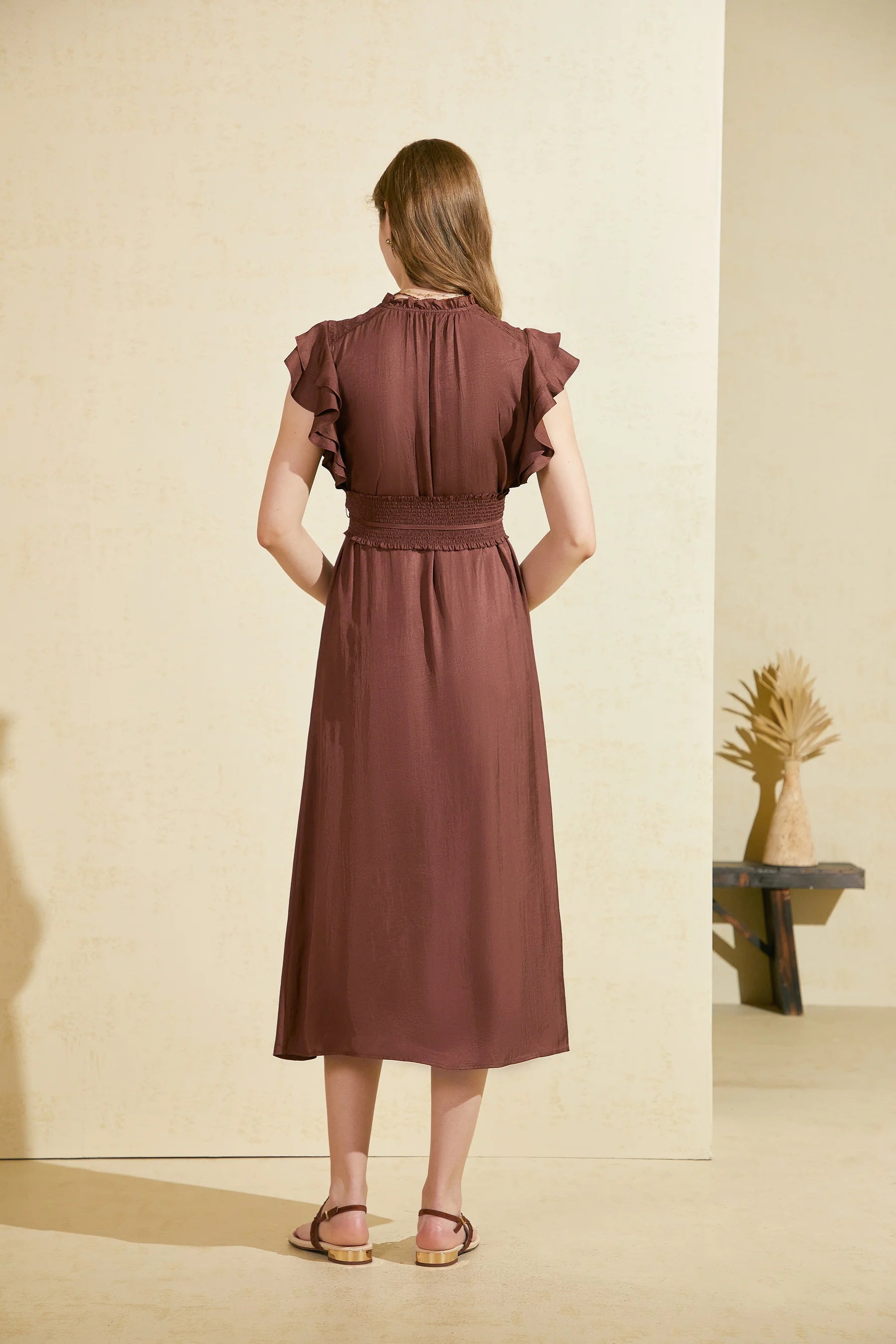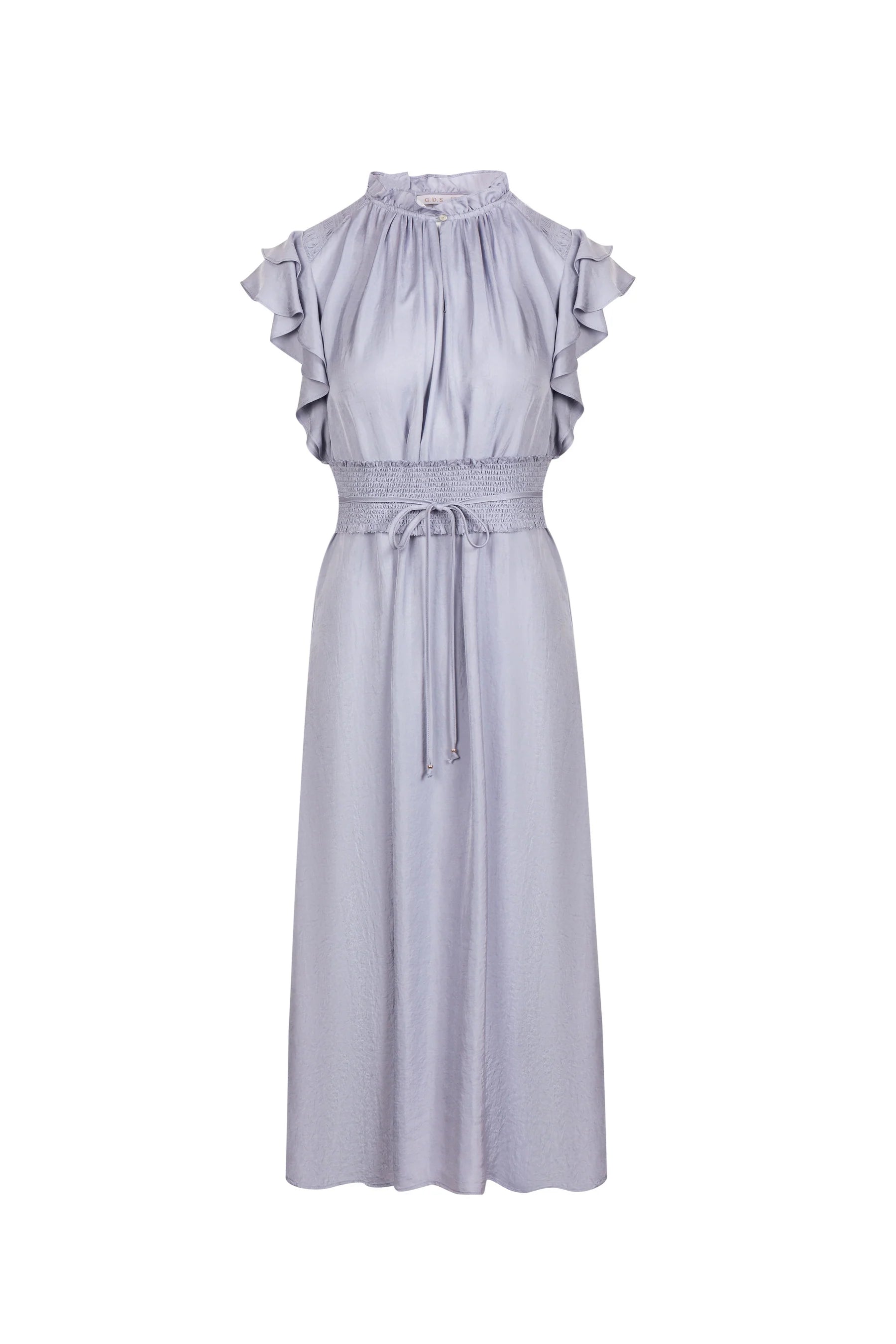 Sebastian shows a women's dress made of acetate fabric, giving it a smooth, fluid drape with a subtle sheen, enhancing its refined and silky appearance. Short flutter sleeves with layered ruffle edges, creating a feminine and airy movement. Elastic smocked waist panel with fine shirring, cinching the waist comfortably while adding texture.